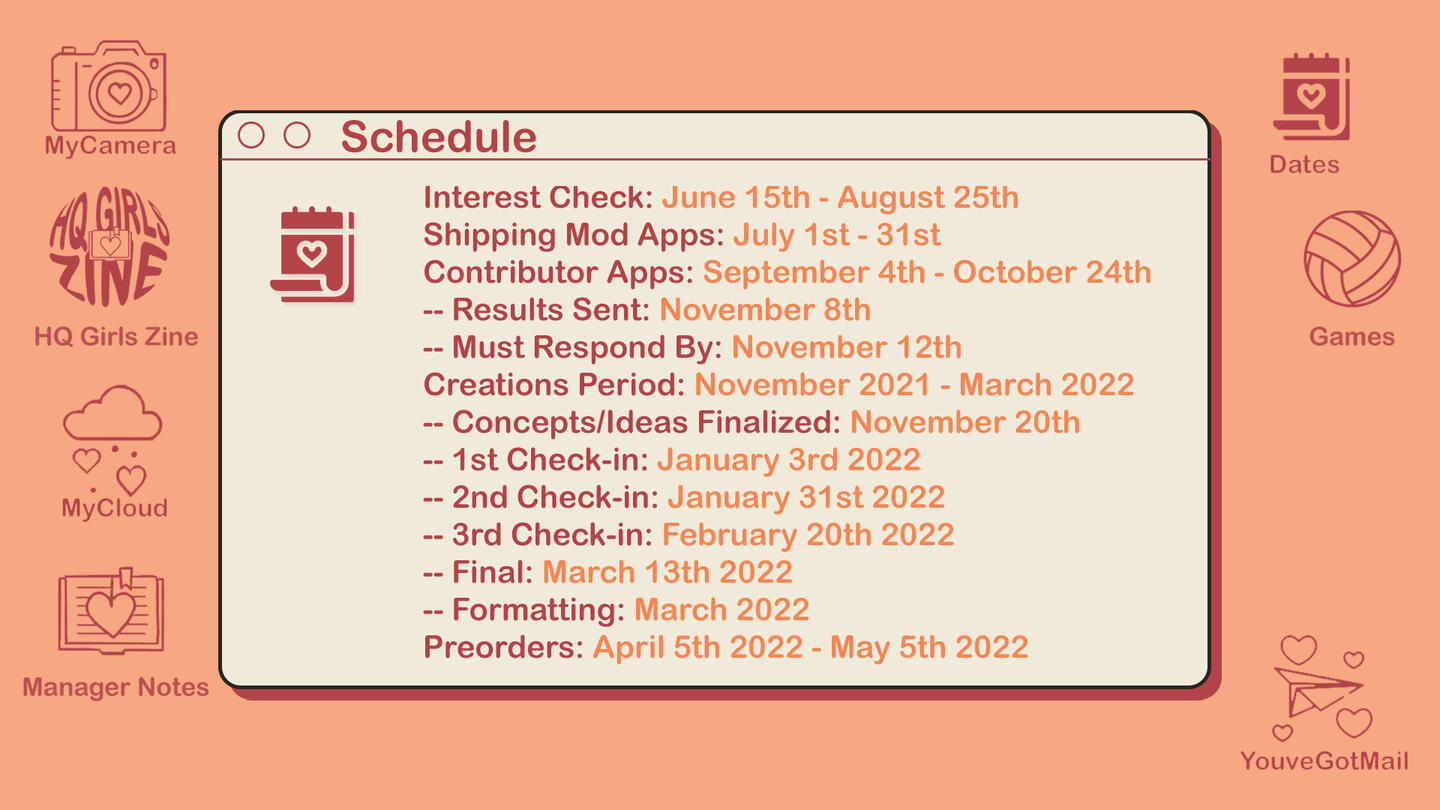 The schedule is unlikely to change regardless of the amount of entries we get from the IC form. This schedule is the one that best accommodates for our personal schedules, and allows preorders to open on Women's History Month.Is the zine for charity or for-profit?
